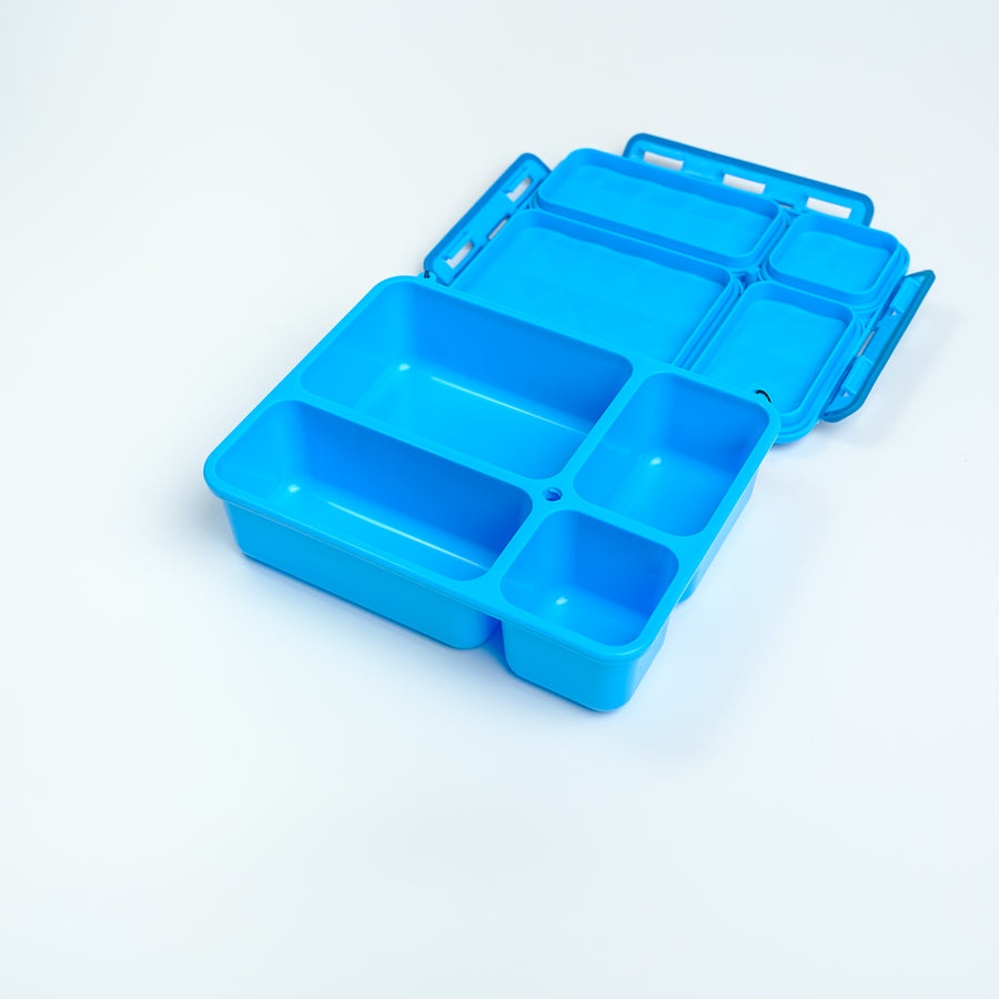 Go Green Lunchboxes utilise "turn ‘n lock technology" to ensure your child’s lunch stays fresh all day. Each of the 4 compartments is individually sealed so food & smells will not leak into each other. The lid is separate from the box, but is held on by toggles so it can't be lost at school! Once the lid is on, turn the lock on the lid to tighten the silicone seals and ensure your lunchbox is leakproof, and your food remains lovely and fresh.