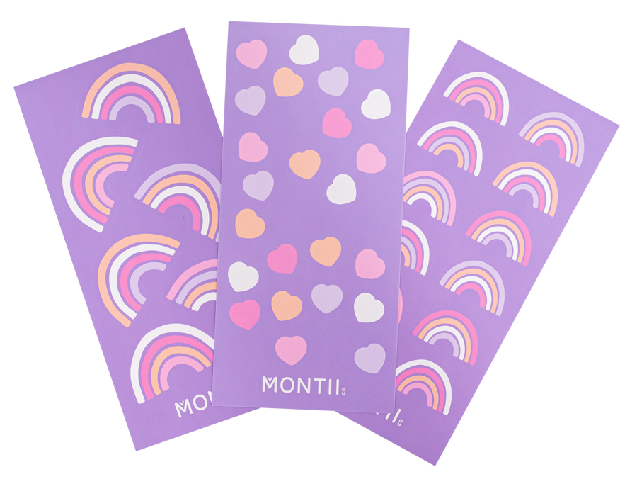 Dishwasher safe, waterproof, and made to match your favourite Montii prints, each pack contains 3 sheets of stickers for you to personalise your Bento Boxes, Drink Bottles and more!