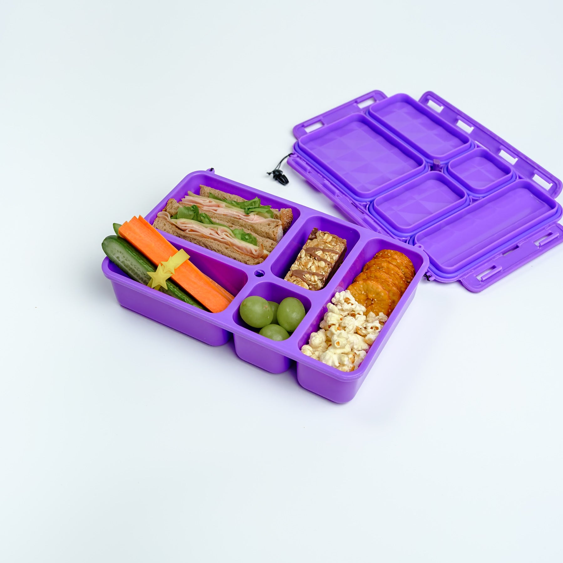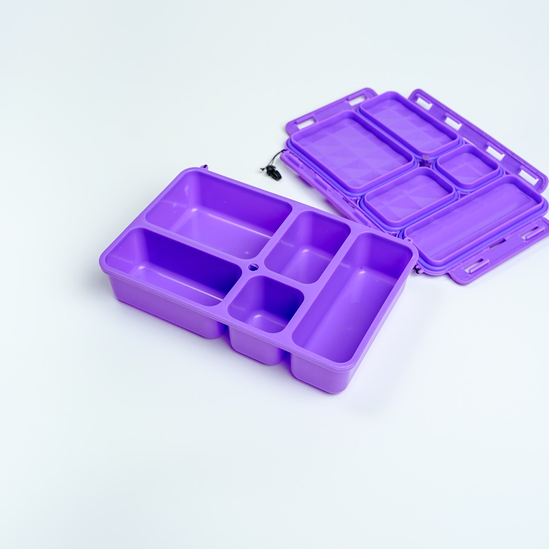 Go Green Lunchboxes utilise "turn ‘n lock technology" to ensure your child’s lunch stays fresh all day. Each of the 5 compartments is individually sealed so food & smells will not leak into each other. The lid is separate from the box, but is held on by toggles so it can't be lost at school! Once the lid is on, turn the lock on the lid to tighten the silicone seals and ensure your lunchbox is leakproof, and your food remains lovely and fresh.